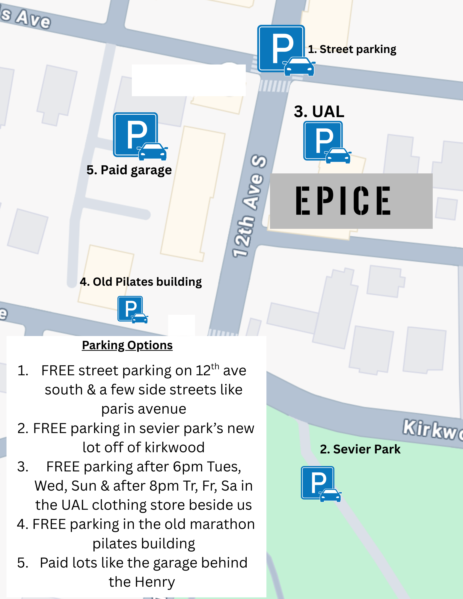 Free Street parking is available on 12th ave south, side streets as well as Sevier Park. The marathon building on the kirkwood/12th s corner is also empty and available for parking. There is a paid lot at the old White’s mercantile at the corner of kirkwood and 12th s. After 6pm weekdays and 8pm weekends, the U.A.L. lot is available for parking as well.